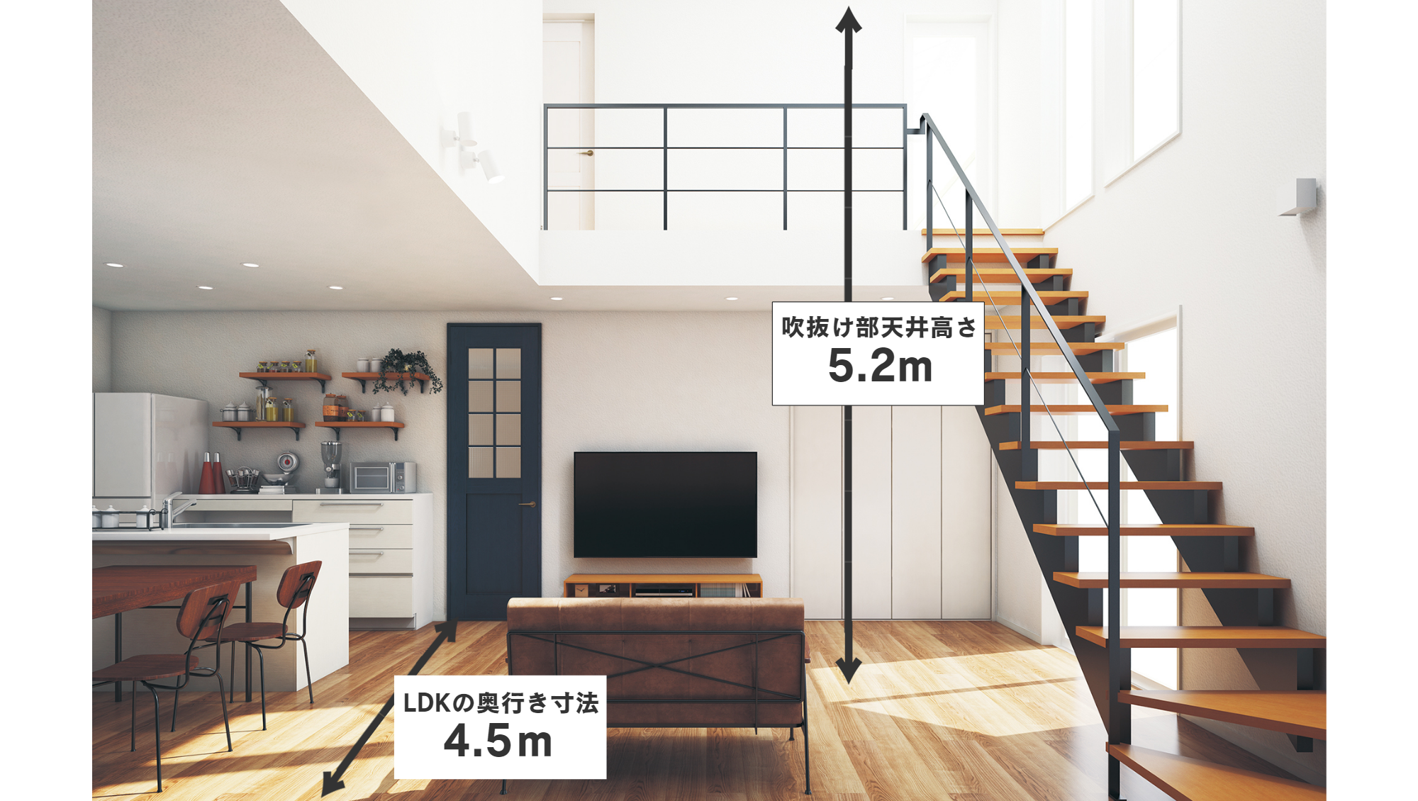 天井高さ 5.2m の吹抜けと、在来木造住宅では難しい柱のない奥行き 4.5m の空間は、タテにもヨコにも空間の広がりを感じさせます。