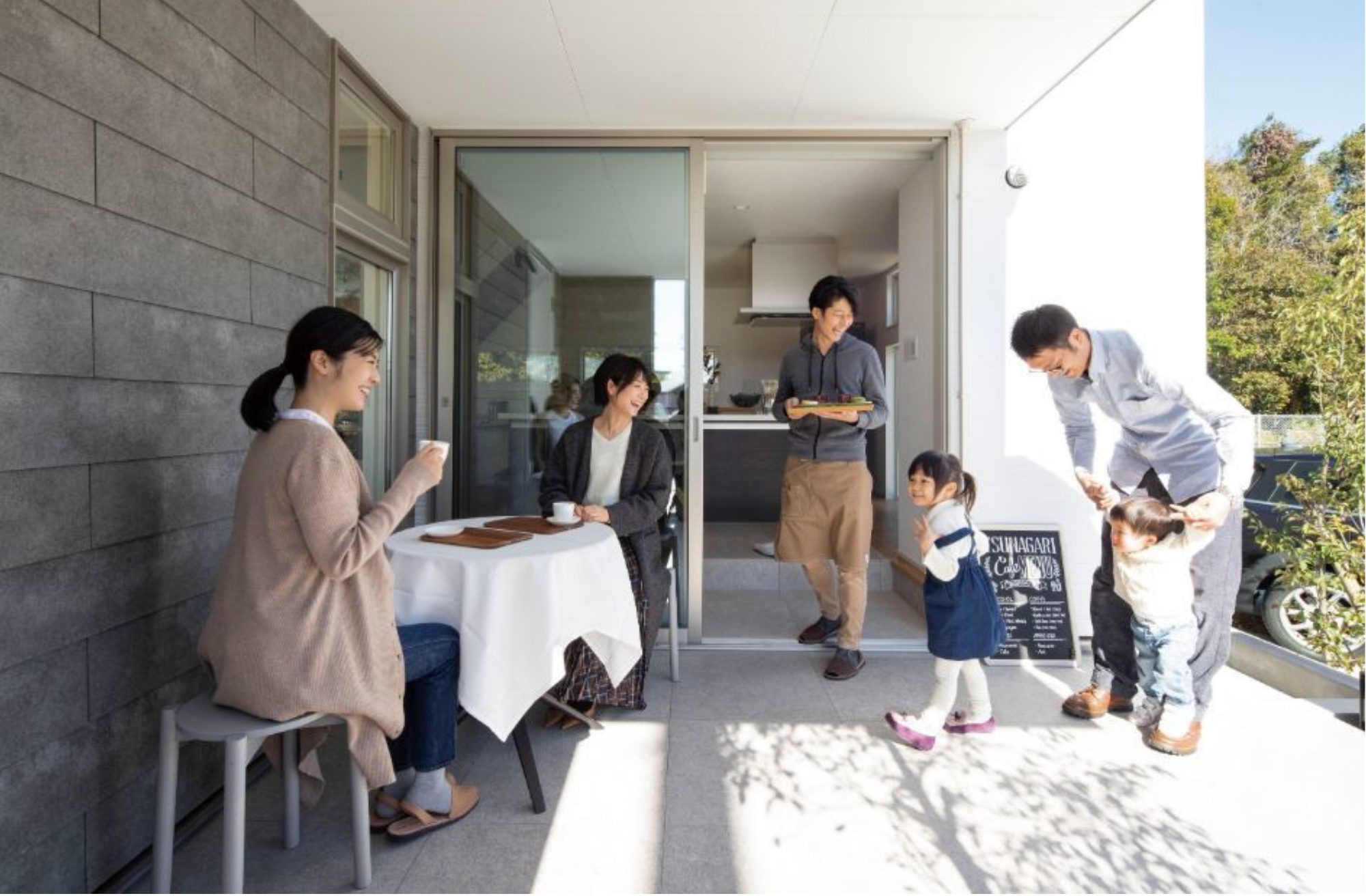 広い軒下にテーブルと椅子をセット。そこは陽ざしも雨も気にせずに友人を招けるわが家のオープンカフェ。キッチンからのアクセスフリーを生かして友人をもてなします。