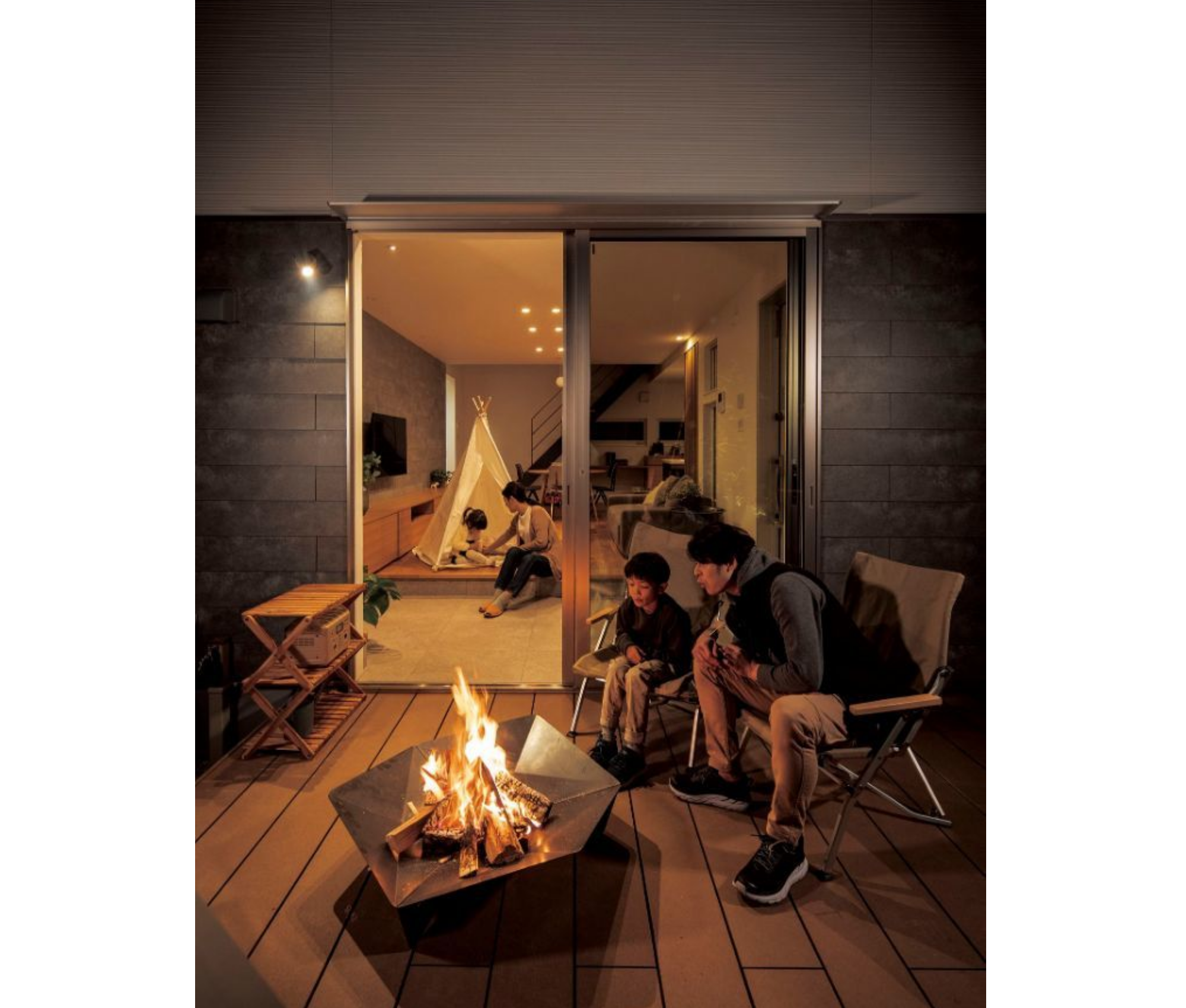 「ウチ」にテントを張って、ウッドデッキではキャンプファイヤー。